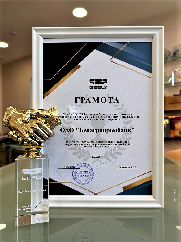 17 марта 2026 года в Минске состоялась церемония награждения лучших партнеров автомобильной отрасли. Дистрибьютор и производитель автомобилей Geely и Belgee в Беларуси СЗАО «БЕЛДЖИ» вручил Белагропромбанку почетную награду за высокое мастерство, профессионализм и лучший результат по количеству реализованных авто- и электромобилей марки Geely в кредит по итогам работы в 2025 году. Награда стала признанием эффективности партнерской программы, которую Белагропромбанк реализует совместно с СЗАО «БЕЛДЖИ» уже несколько лет. Благодаря выгодным условиям автокредитования, которые включают ставки от 1,99% годовых и возможность выбора грейс-периода, наши граждане получают широкий доступ к современным автомобилям отечественной сборки.