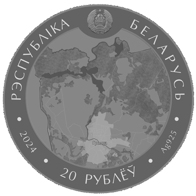 по кругу вверху – рельефное изображение Государственного герба Республики Беларусь и надпись: РЭСПУБЛІКА БЕЛАРУСЬ; в центре изображение Августовского канала на карте Гродненской области; внизу – номинал 20 РУБЛЁЎ, справа – проба сплава, слева – год чеканки.