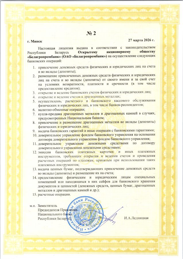 License for banking activities of the National Bank of the Republic of Belarus No. 2 dated March 27, 2026.